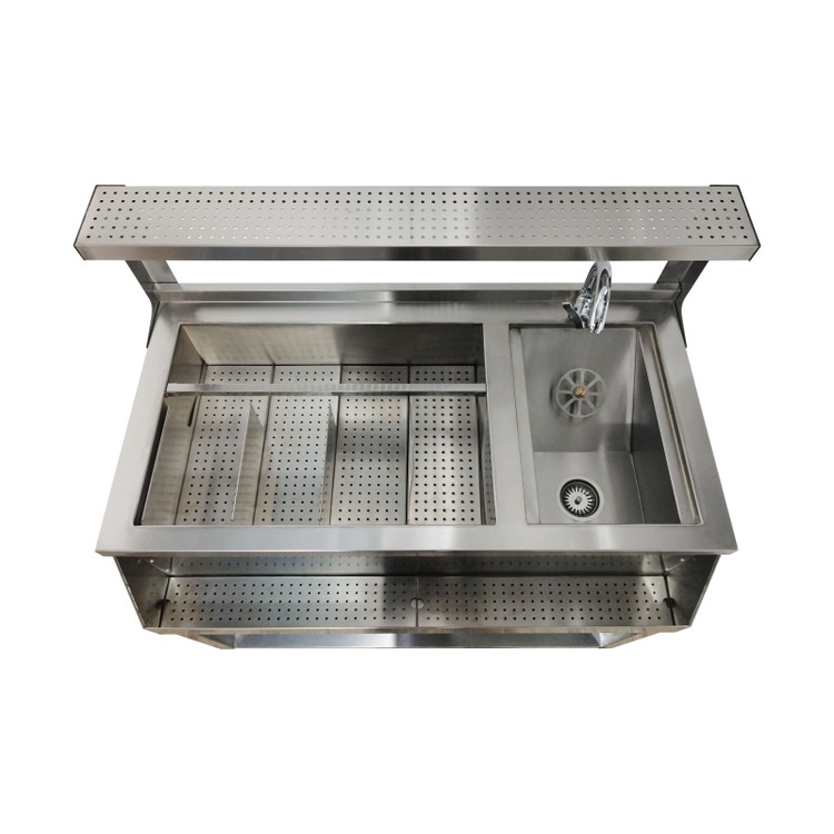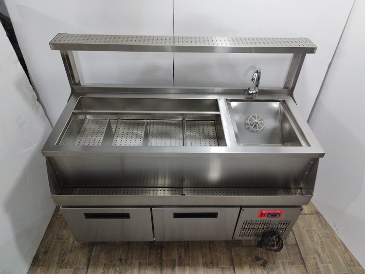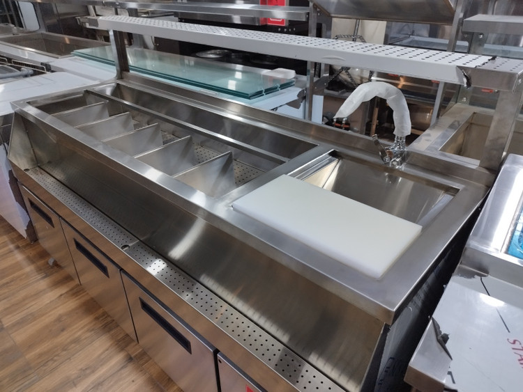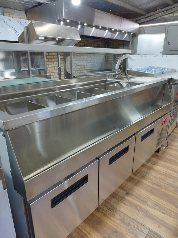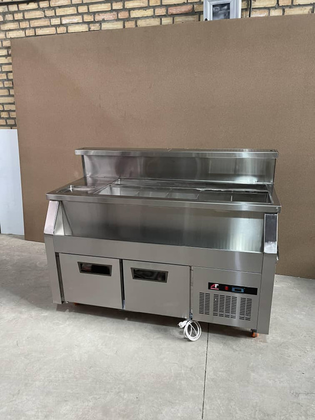 باراستیشن در اندازه ۱۲۰/۱۵۰/۱۸۹ سانت در ۸۵ سانت با جای بطری شیشه ای ، یک عدد سینک تک لگن ،پیجرشور، دارای جای تخته برای خورد کردن میوه و جای یخ ، دارای ۱۲ عدد بن ماری ۱/۶ برای ۱۵۰ سانت ، برای پرکردن میوه شکلات، تنقلات و ... زیر دستگاه یخچال دو درب تا دمای منفی ۳ درجه این دستگاه با استیل ۴۳۰ ضد زنگ میباشد با موتور امبراکو و درجه دیجیتال و نمایش گر دیجیتال میباشد دارای دستگاه بار استیشن با رف بالا که در آن میتوان مت بار هم گذاشت این دستگاه با وردی متصل به آب لوله کشی ، خروجی آب به فاضلاب میباشد